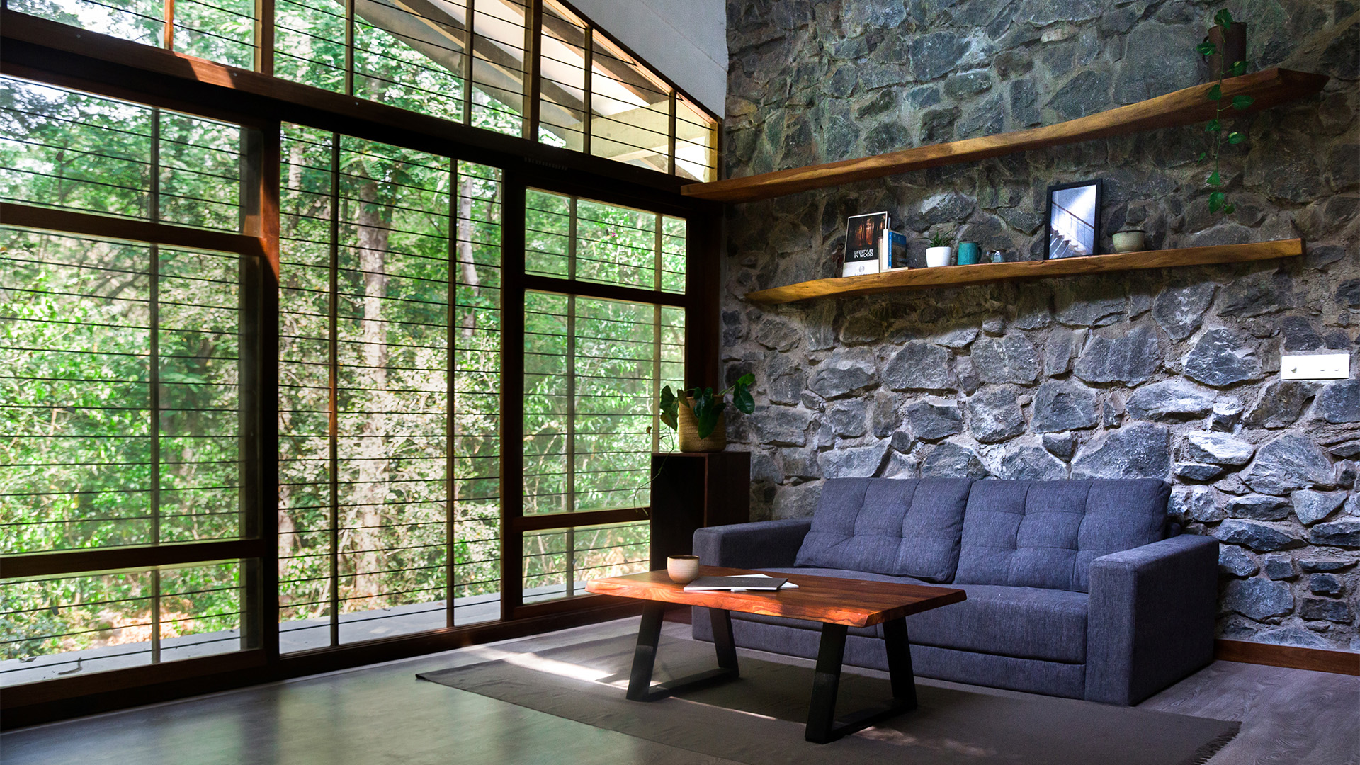 The interior spaces reflect a simplistic lifestyle with a focus on comfort and functionality. It intentionally plays down the design to bring the surrounding forest into the foreground. The double height space, as part of the passive design strategies, maintains a comfortable internal climate through convection. Likewise, the granite establishes a stable cool temperature due to its remarkable ability to dissipate heat.