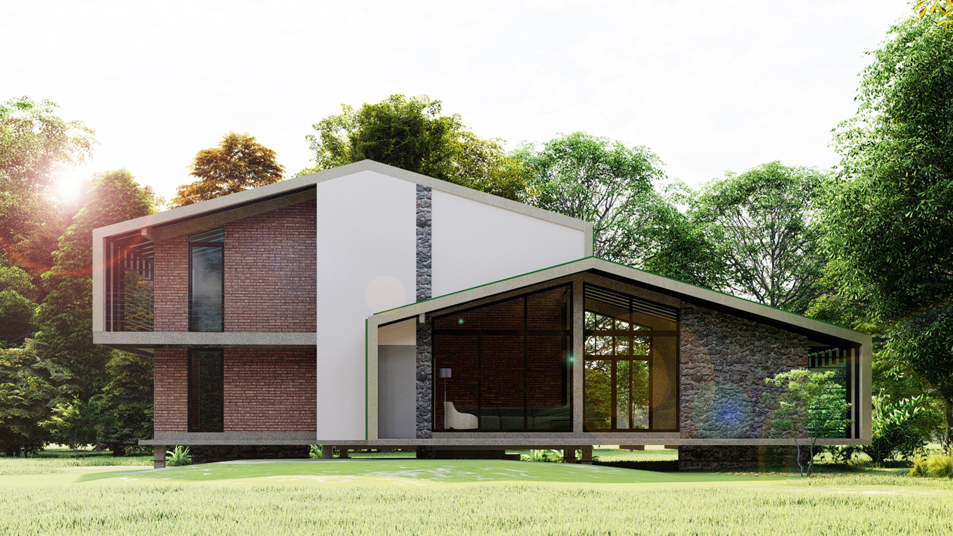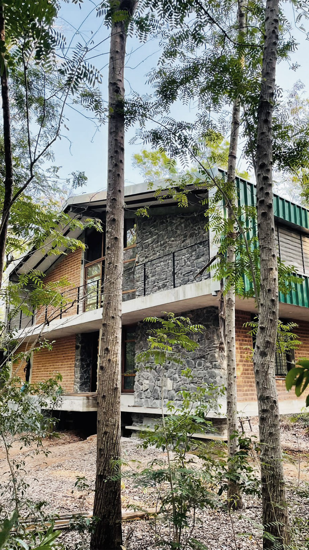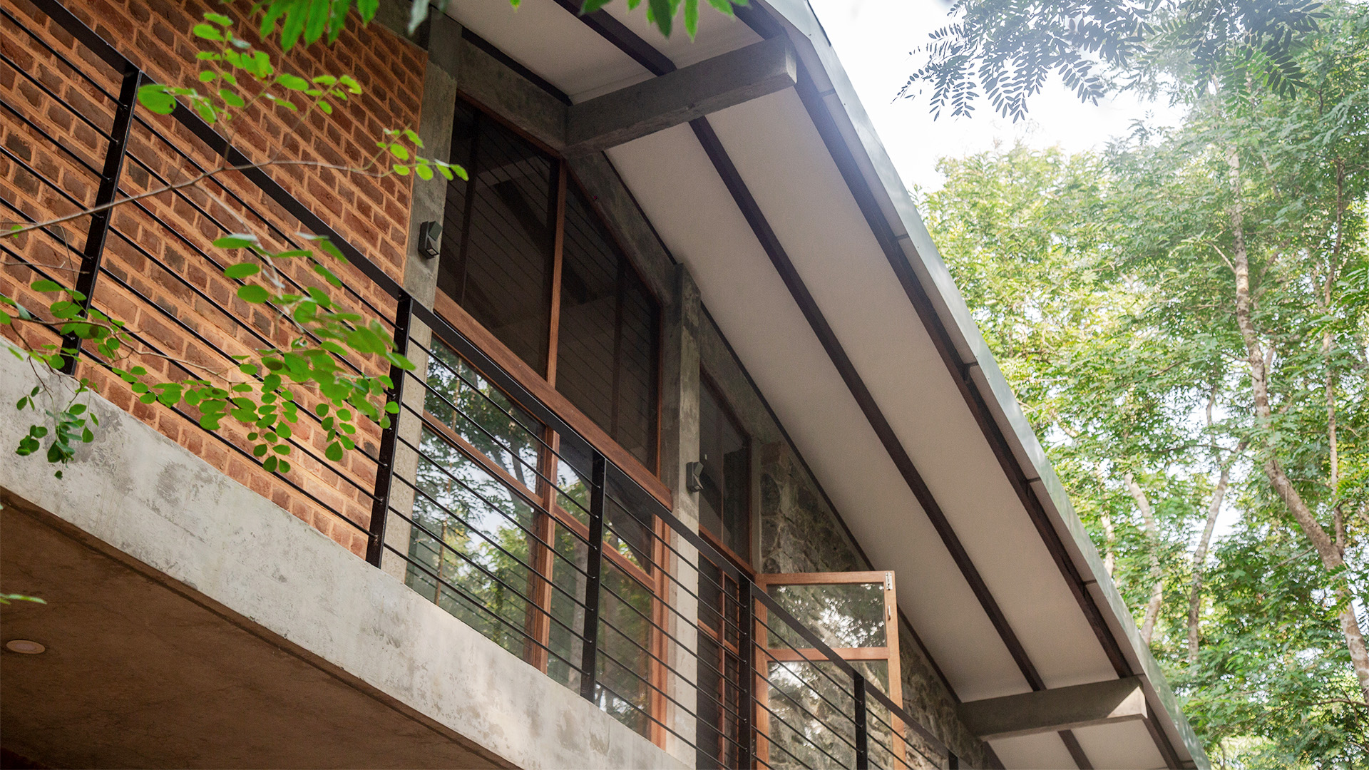 Adopting the play of textures and light of the forest, the facade reflects a truthfulness to its architecture, assembling a range of local materials and construction methods. Distinguished by the play of two intersecting continuous frames, the facade finds its balance in the abstraction of the conventional roof overhang, merged into vertical elements along the east and west sides of the building. The large overhangs wrapping the building create additional spaces for storage, sit-out, and balconies.