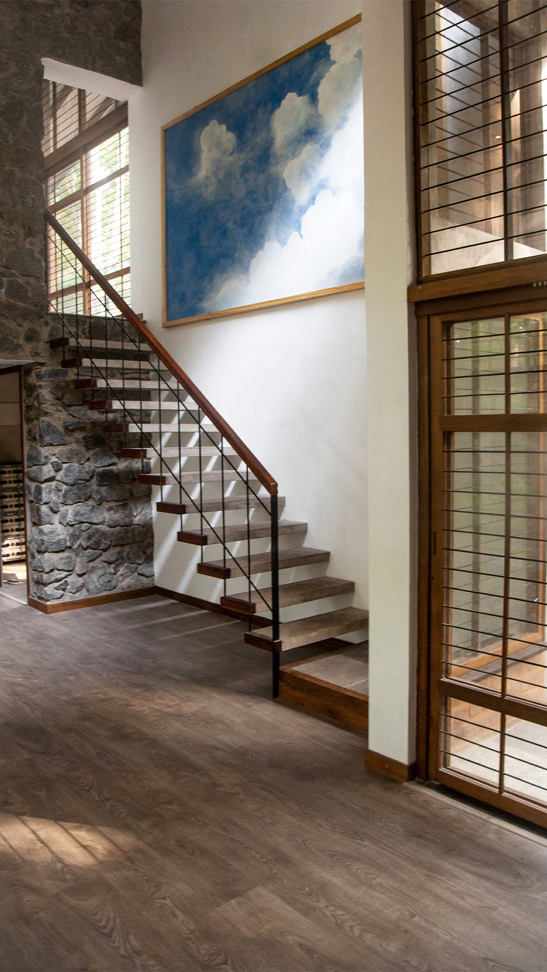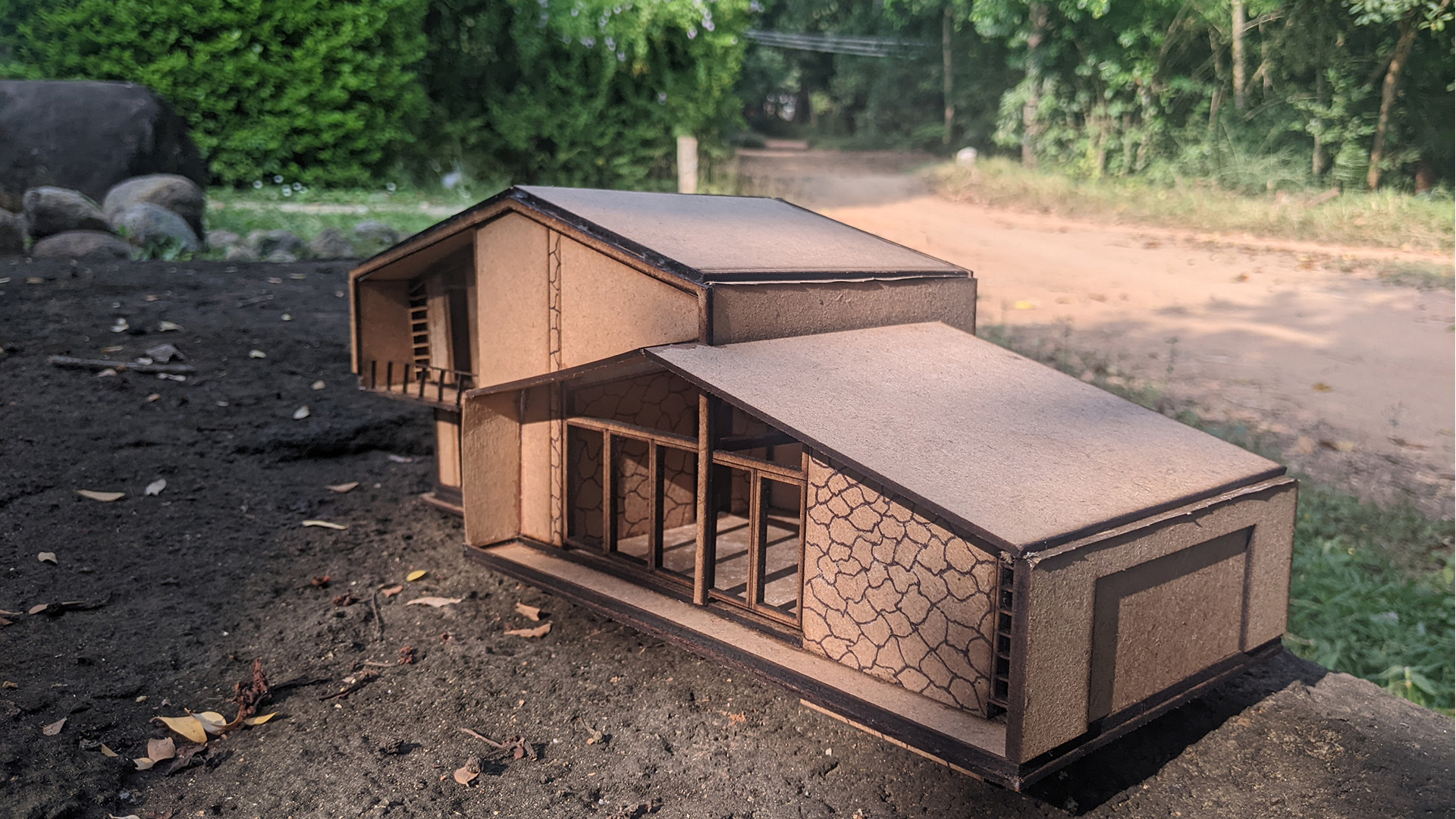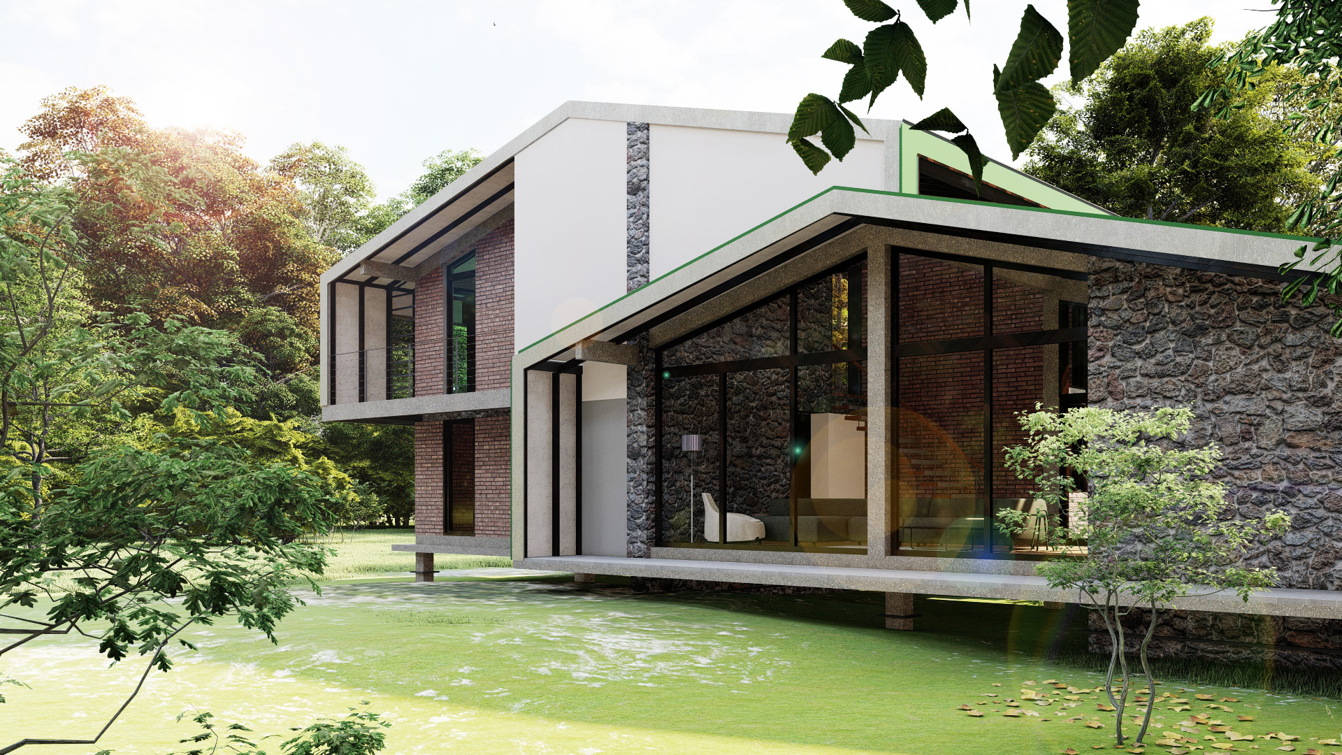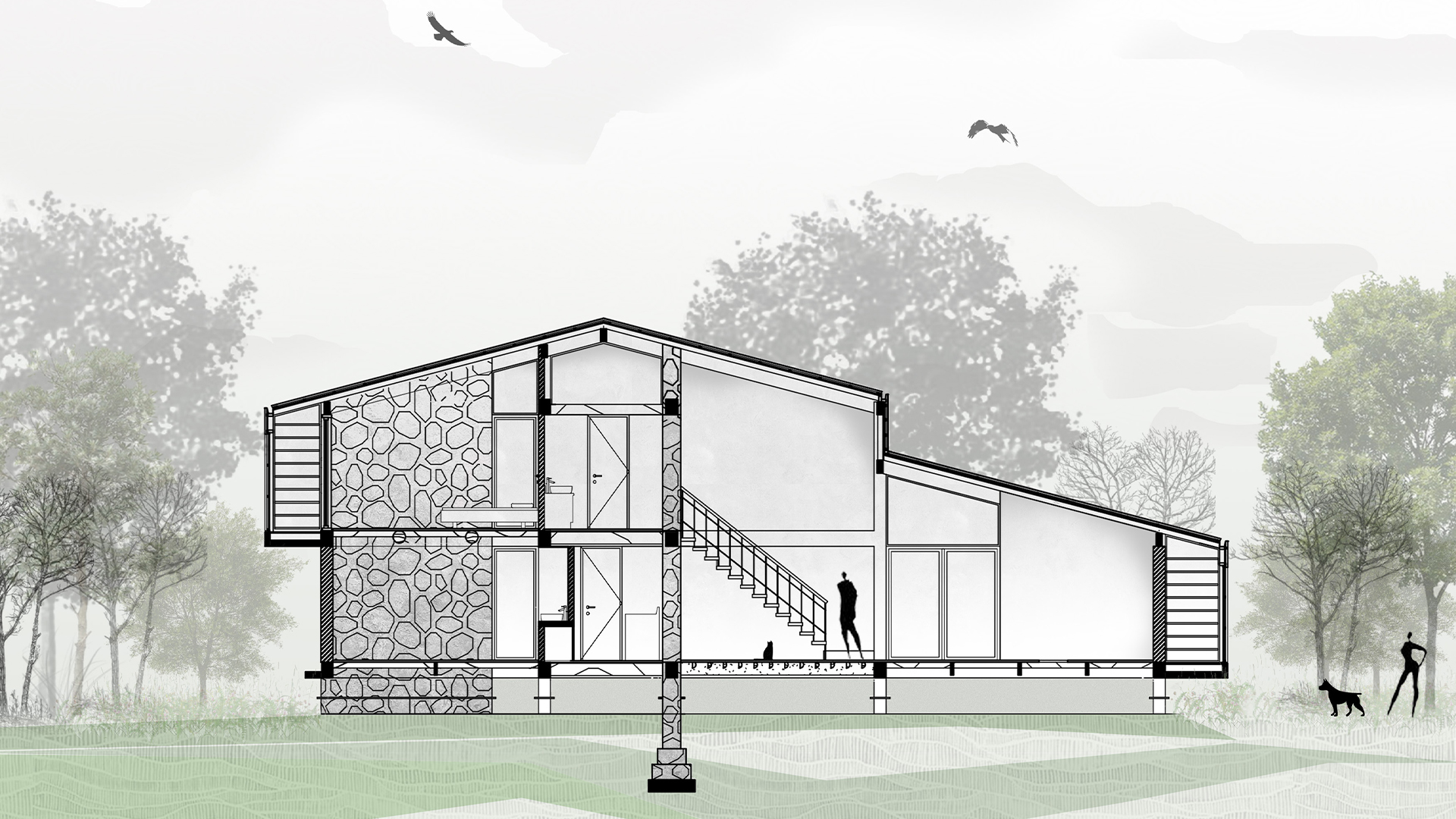 Adopting the play of textures and light of the forest, the facade reflects a truthfulness to its architecture, assembling a range of local materials and construction methods. Distinguished by the play of two intersecting continuous frames, the facade finds its balance in the abstraction of the conventional roof overhang, merged into vertical elements along the east and west sides of the building. The large overhangs wrapping the building create additional spaces for storage, sit-out, and balconies.