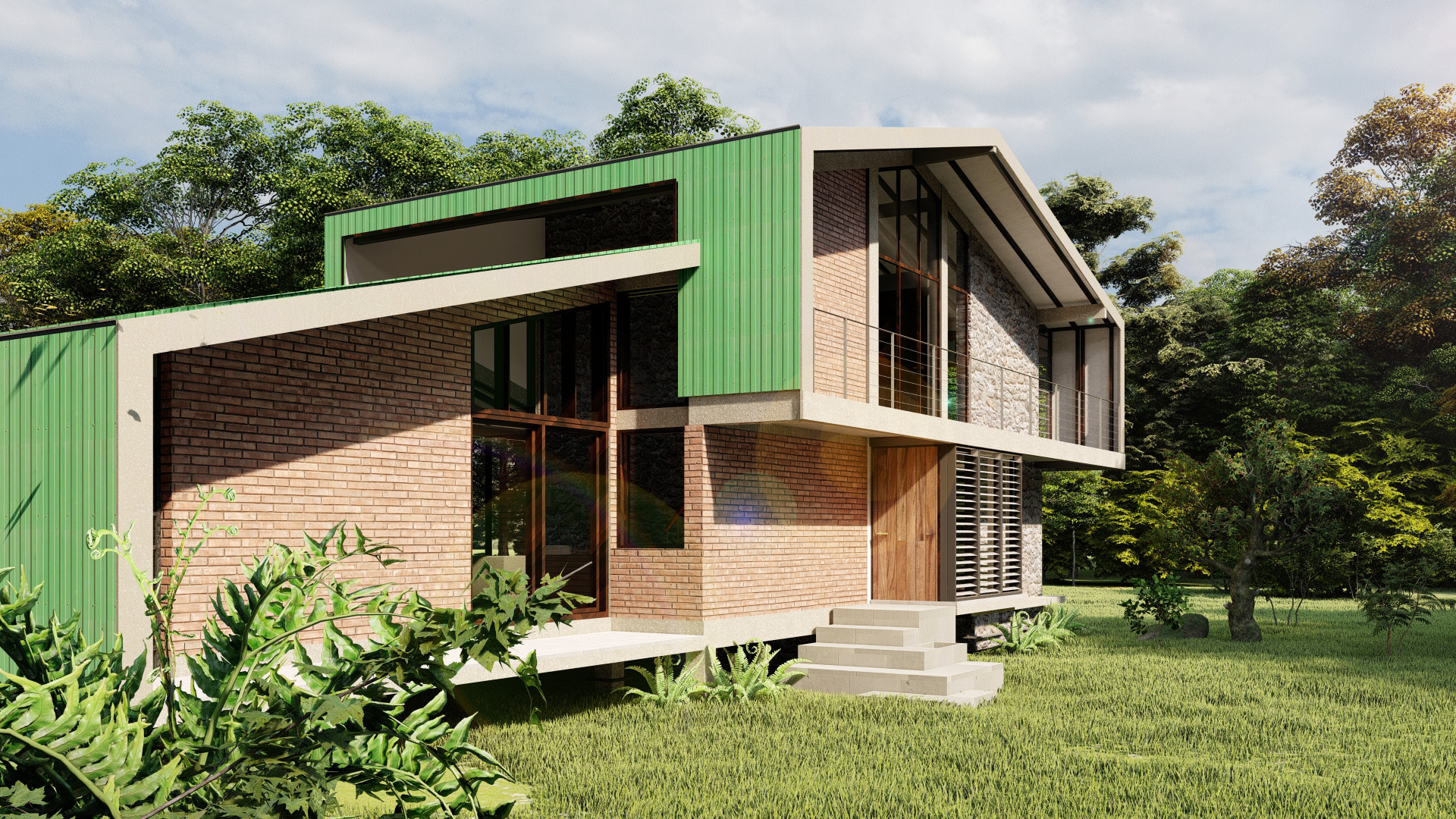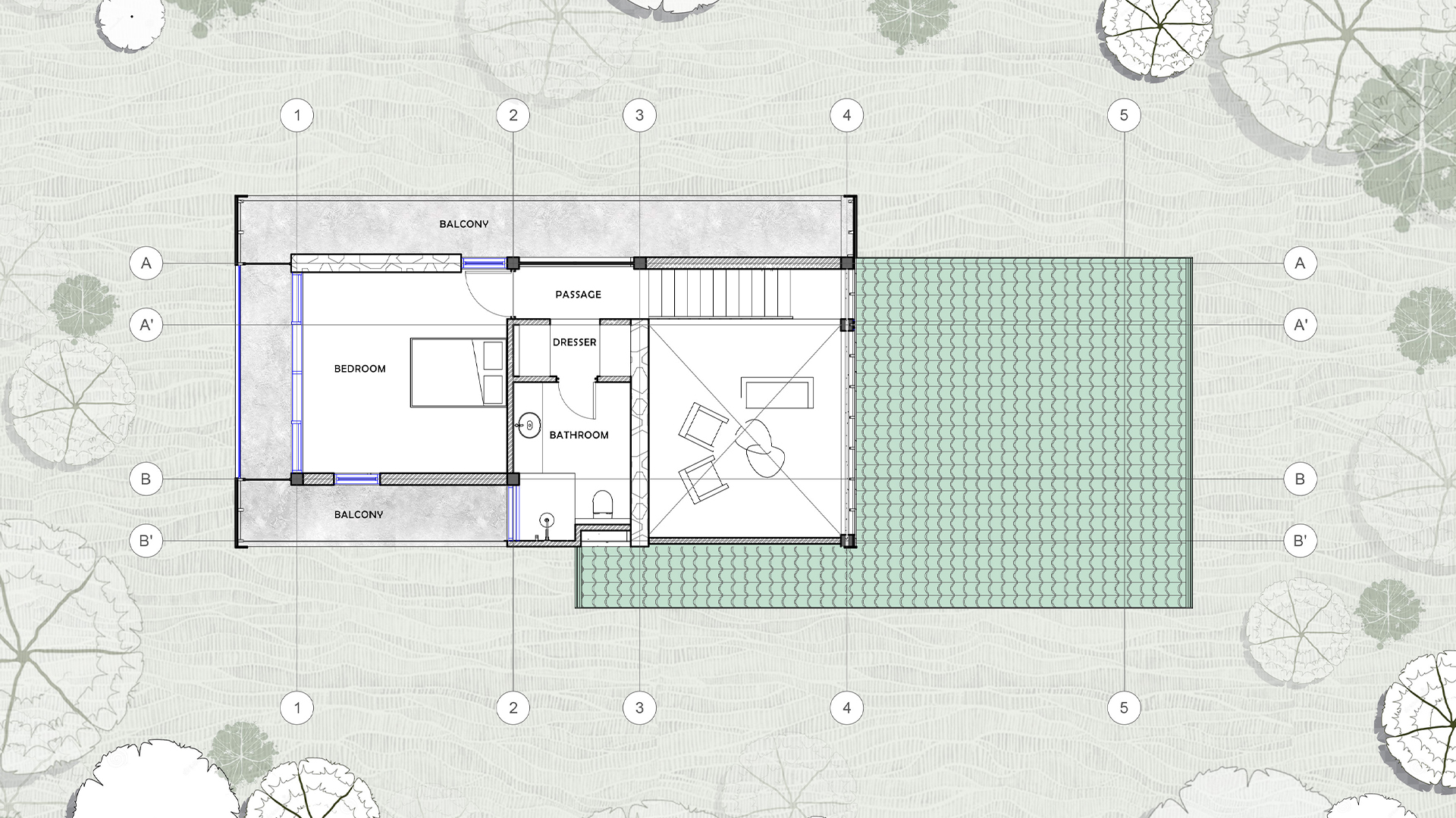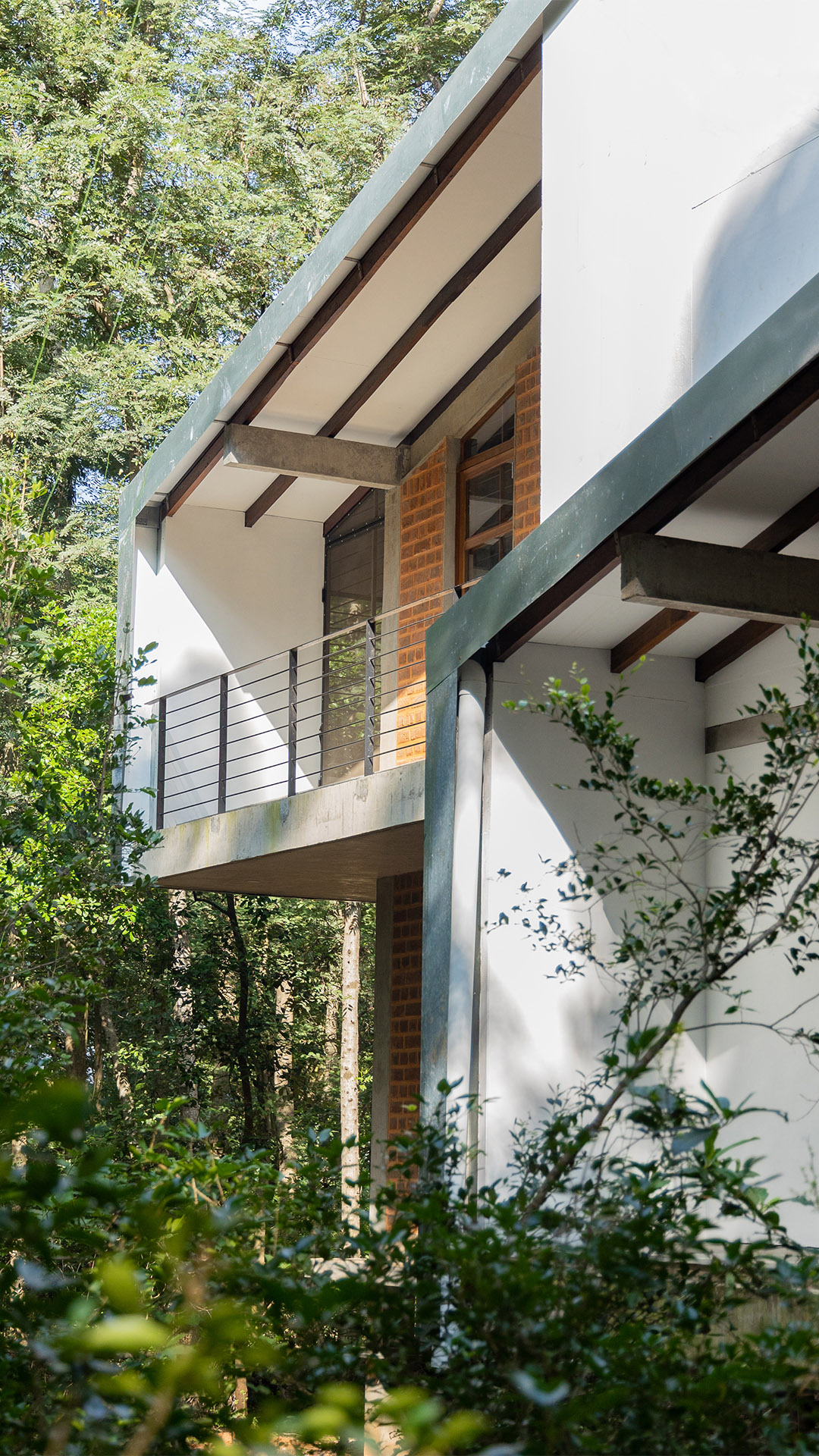 The ground floor accommodates an open living, dining, kitchen, and a bedroom with a common bathroom. The upper floor contains the master bedroom which abuts the dresser and bathroom. While, large balcony spaces fold directly into the onset of the forest canopy.