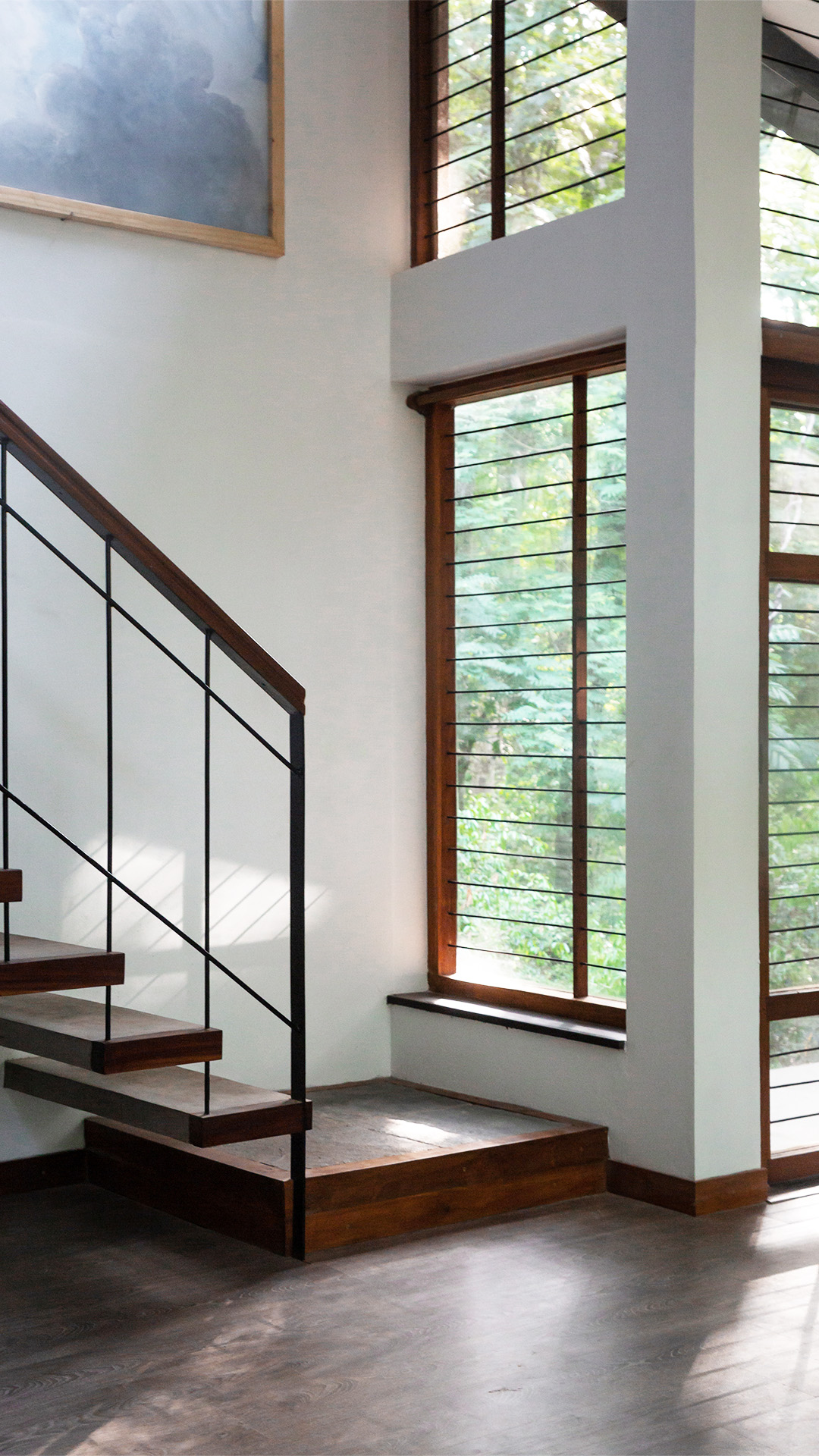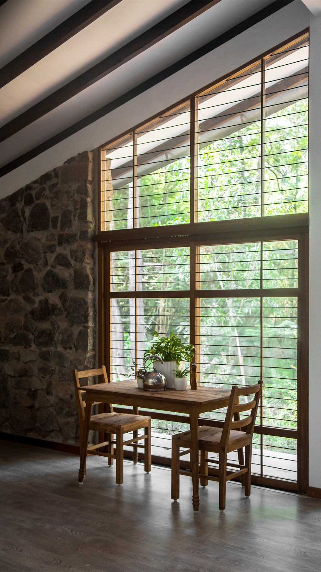 Large windows towards north and south bring in maximum daylight, furthermore kindling a play of light and shadow which is filtered through the foliage of the surrounding trees, creating an avenue for a picturesque view.