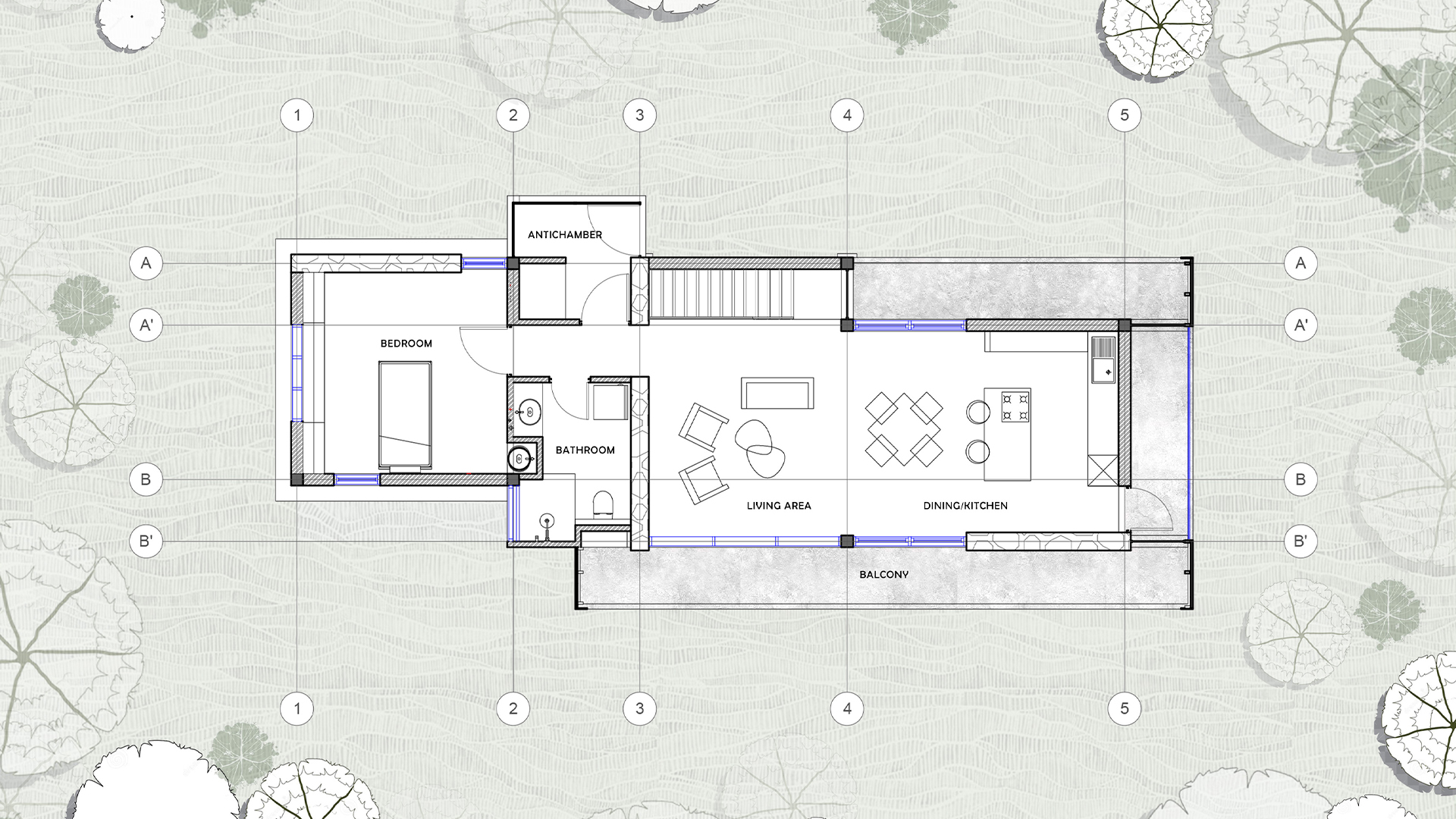The plan carefully finds space between the existing trees ensuring the forest is unaltered.