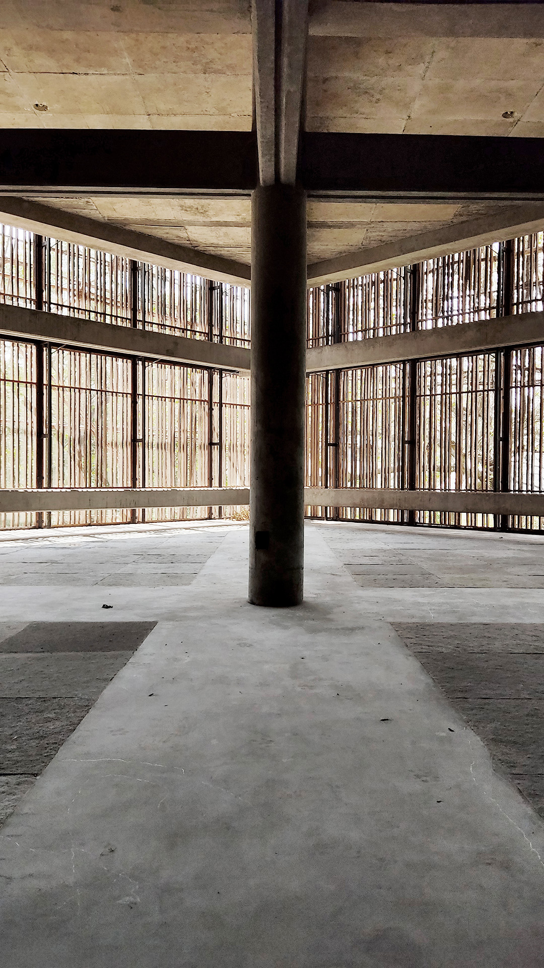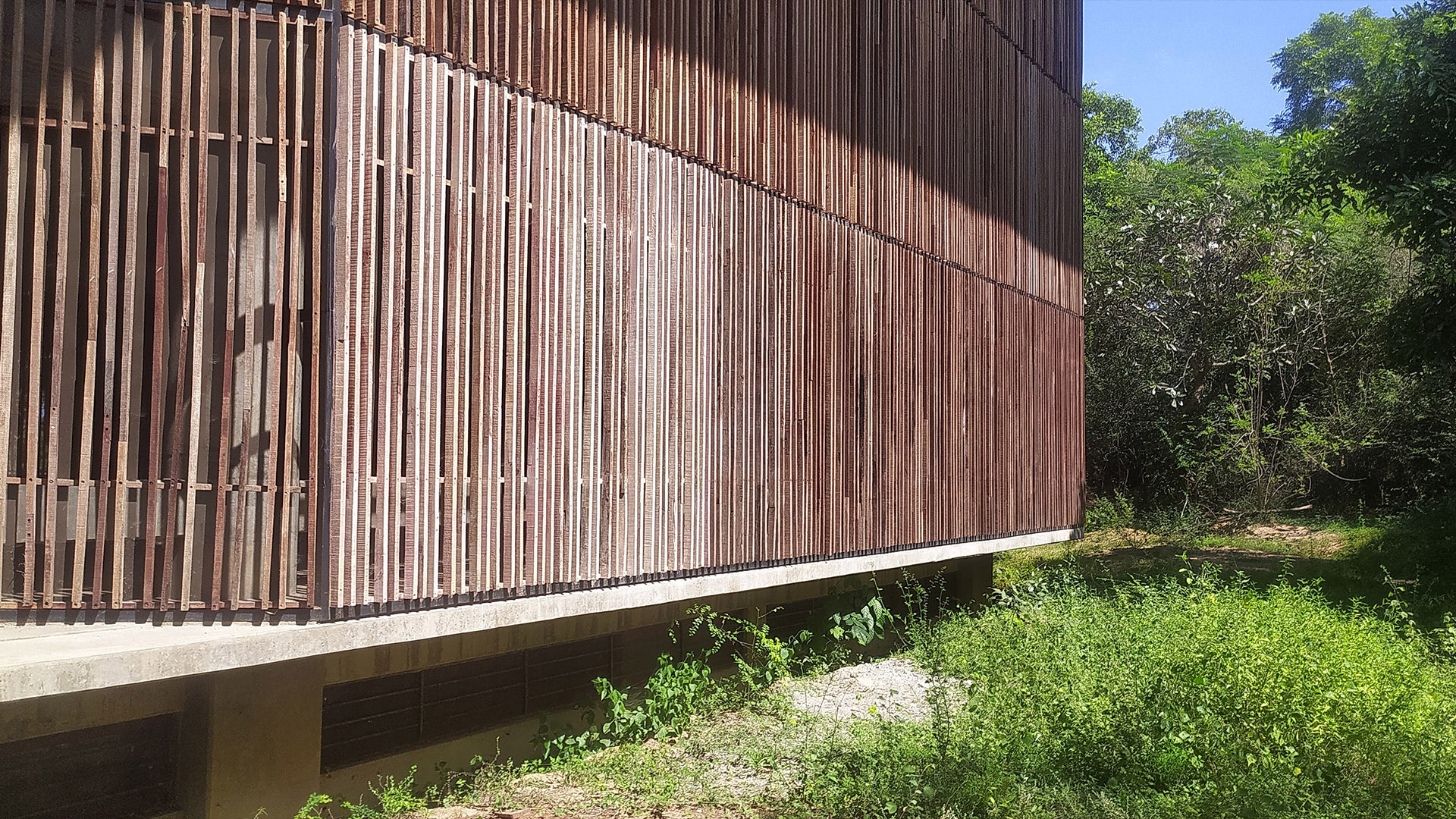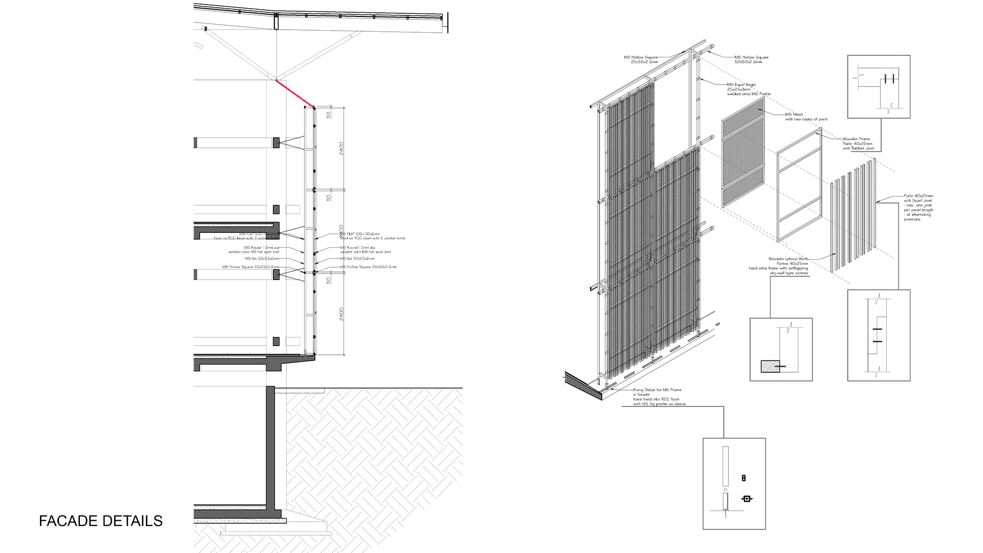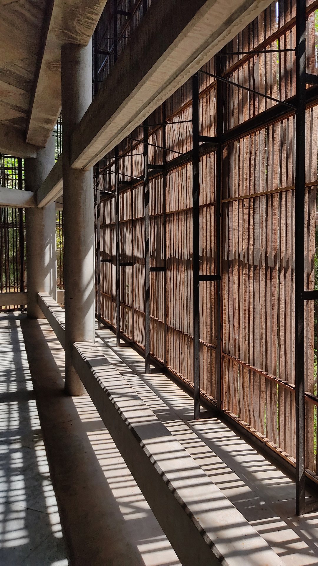 Maximizing natural ventilation and light, it was important to create a permeable facade that is easy to maintain and simple enough in its execution to engage the limited labor during COVID-19 and allow for speedy completion. Playful explorations of merging readily available materials with a new simplified construction approach resulted in a lightweight modular skin of the building made of fire-proofed solid wood lattice-work panels with mesh, versatile enough to ensure easy servicing and adaptation to future upgrades.