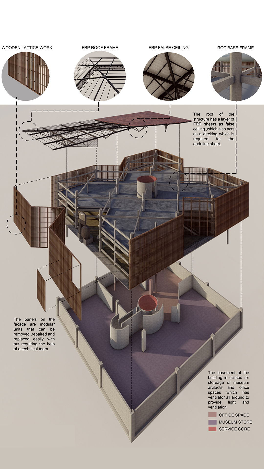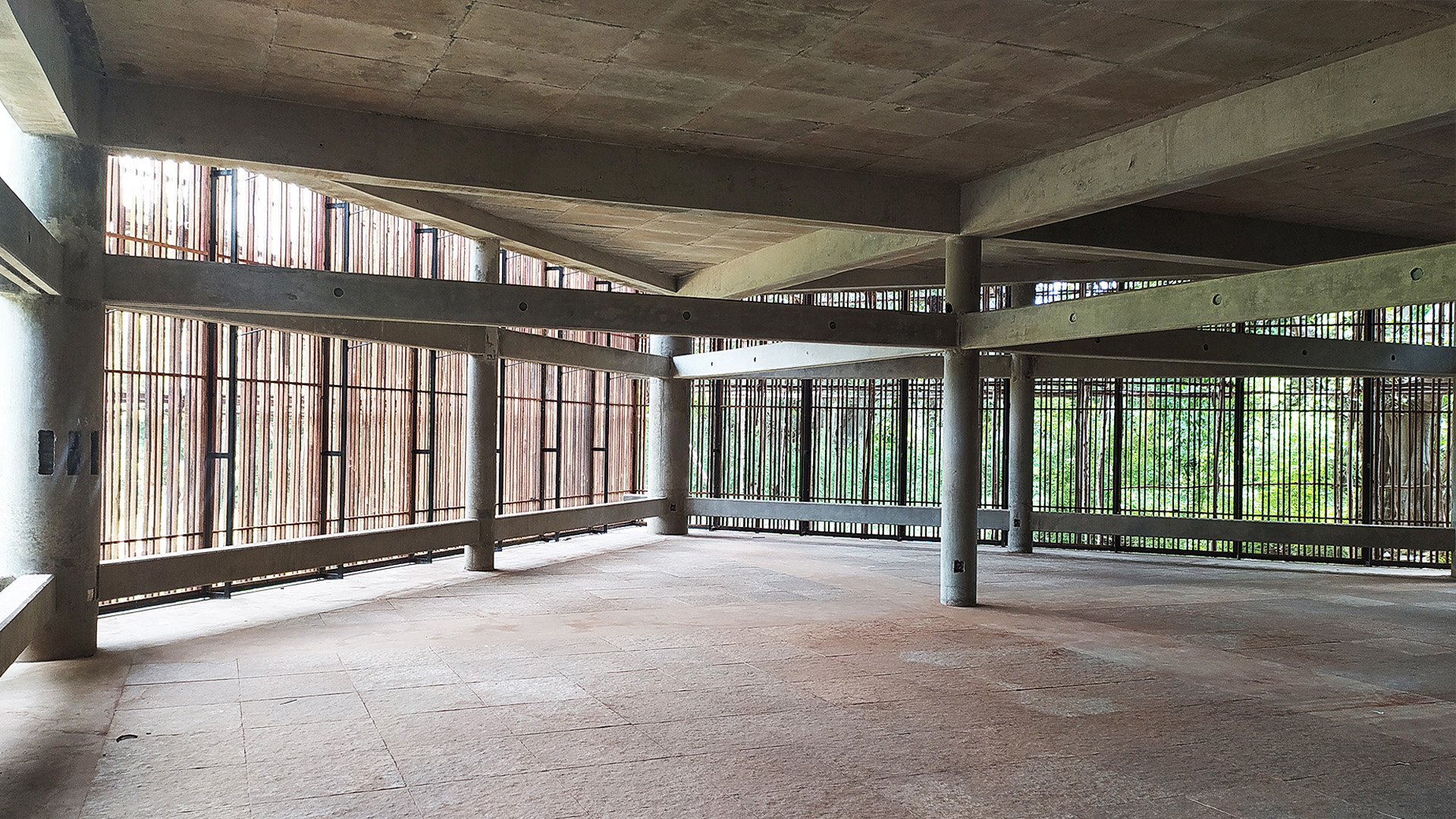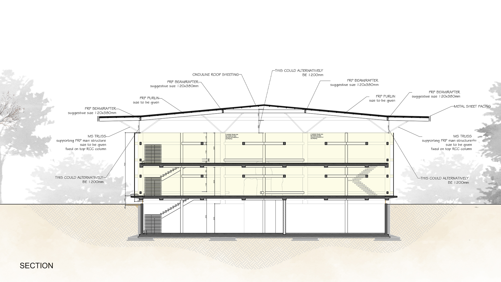 With over 1400 sqm this project is the largest single roof made of FRP beams in India cantilevering nearly 5 meters out. The outer skin is made of a custom-made FRP sheet layer, acting as the false ceiling, and an Onduline sheet layer as the outer protective skin.